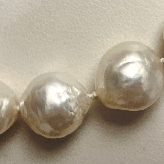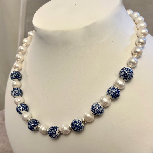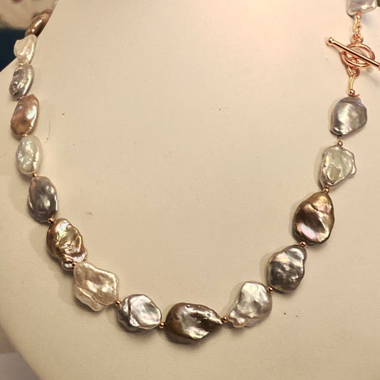 Long pearl and garnet necklace with a sterling silver toggle clasp