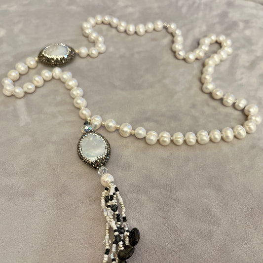 Pearl with elements in Mother of Pearl surrounded by crystals
